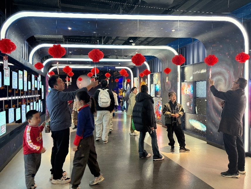 星空走廊里,红色的灯谜错落悬挂于灯笼之下,形成了一道亮眼的风景。每一条谜面,都藏着传统文化与科技知识的考验。观众们或三五成群、并肩低语,或独自凝神、静静思索,在灯影与字谜之间,感受传统民俗的独特魅力。猜对谜题,还能获赠一份惊喜礼品,大家在欢声笑语中开动脑筋、收获快乐,让元宵佳节更添暖意,也让中华优秀传统文化在趣味互动中薪火相传。