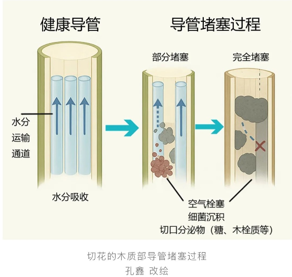 切花本身仍然进行着蒸腾作用导致水分流失。同时,剪切使花茎的木质部导管直接暴露,空腔化和切面创伤反应等导致导管堵塞,进一步阻碍花枝水分吸收。
