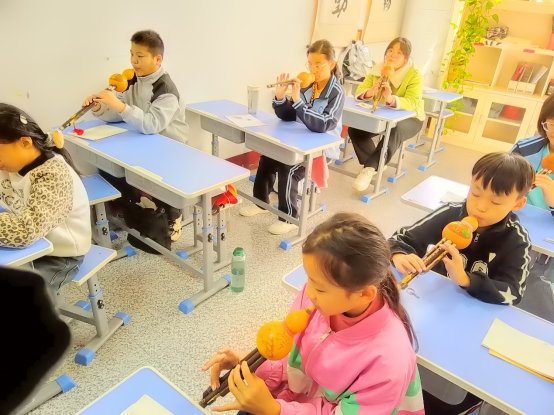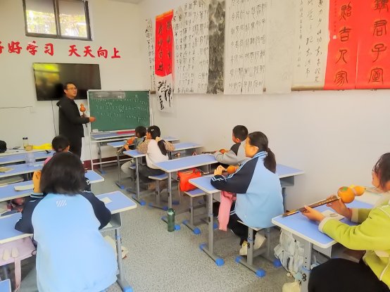 葫芦丝教学现场,郭超老师从乐器构造、持握姿势等基础内容切入,通过趣味示范帮助孩子们快速建立认知。“手指轻按音孔,气息均匀绵长”,逐一对孩子的动作进行指导纠正。经过反复练习,原本生涩的《小星星》旋律在孩子们的吹奏下逐渐变得流畅,稚嫩的乐声中充满了活力。