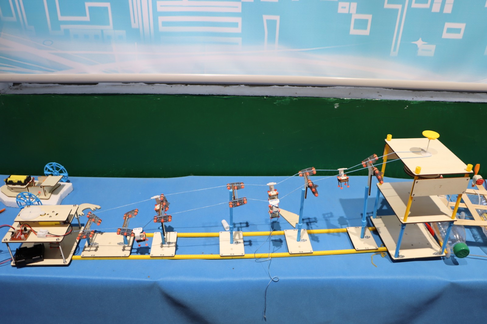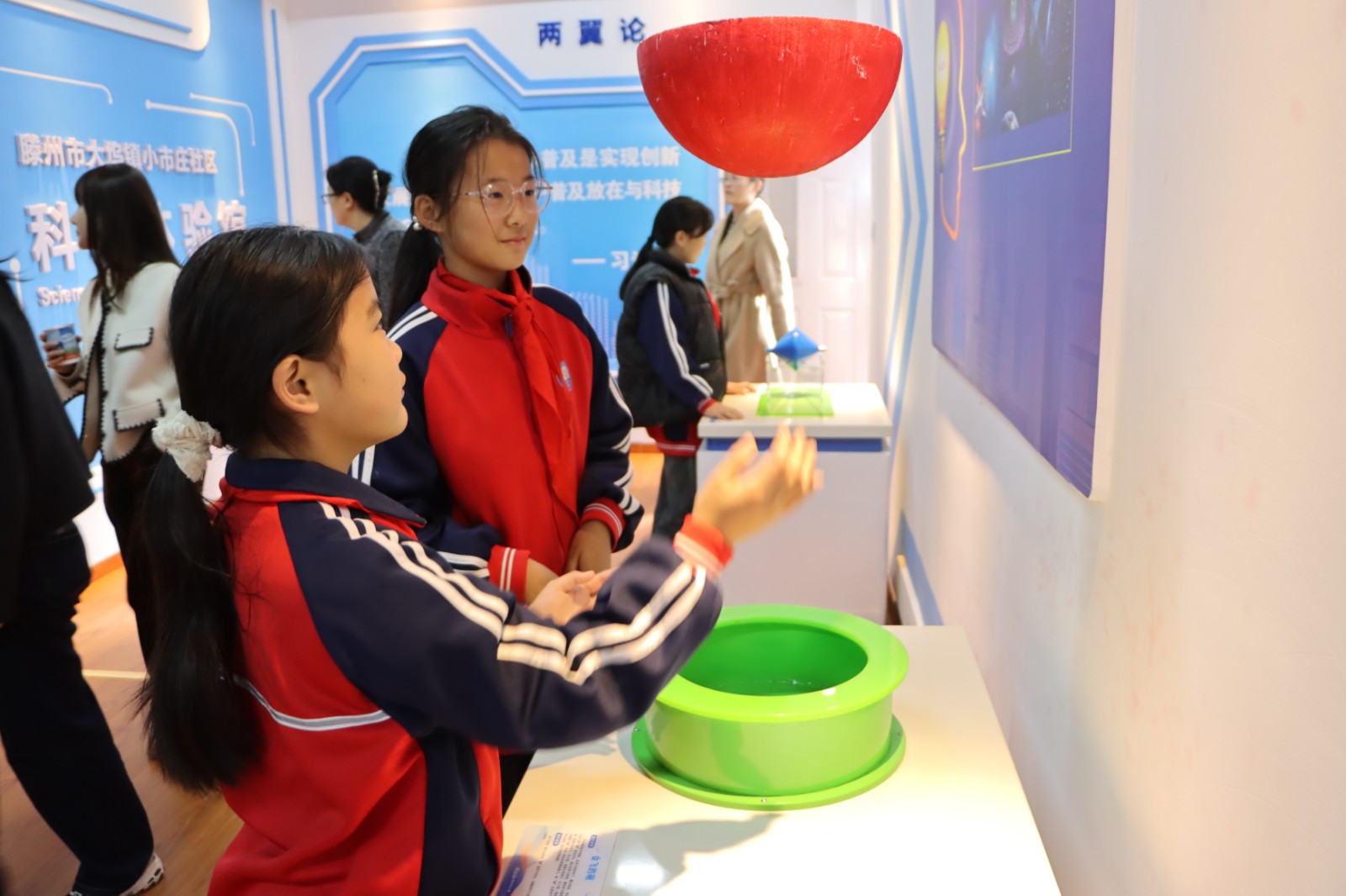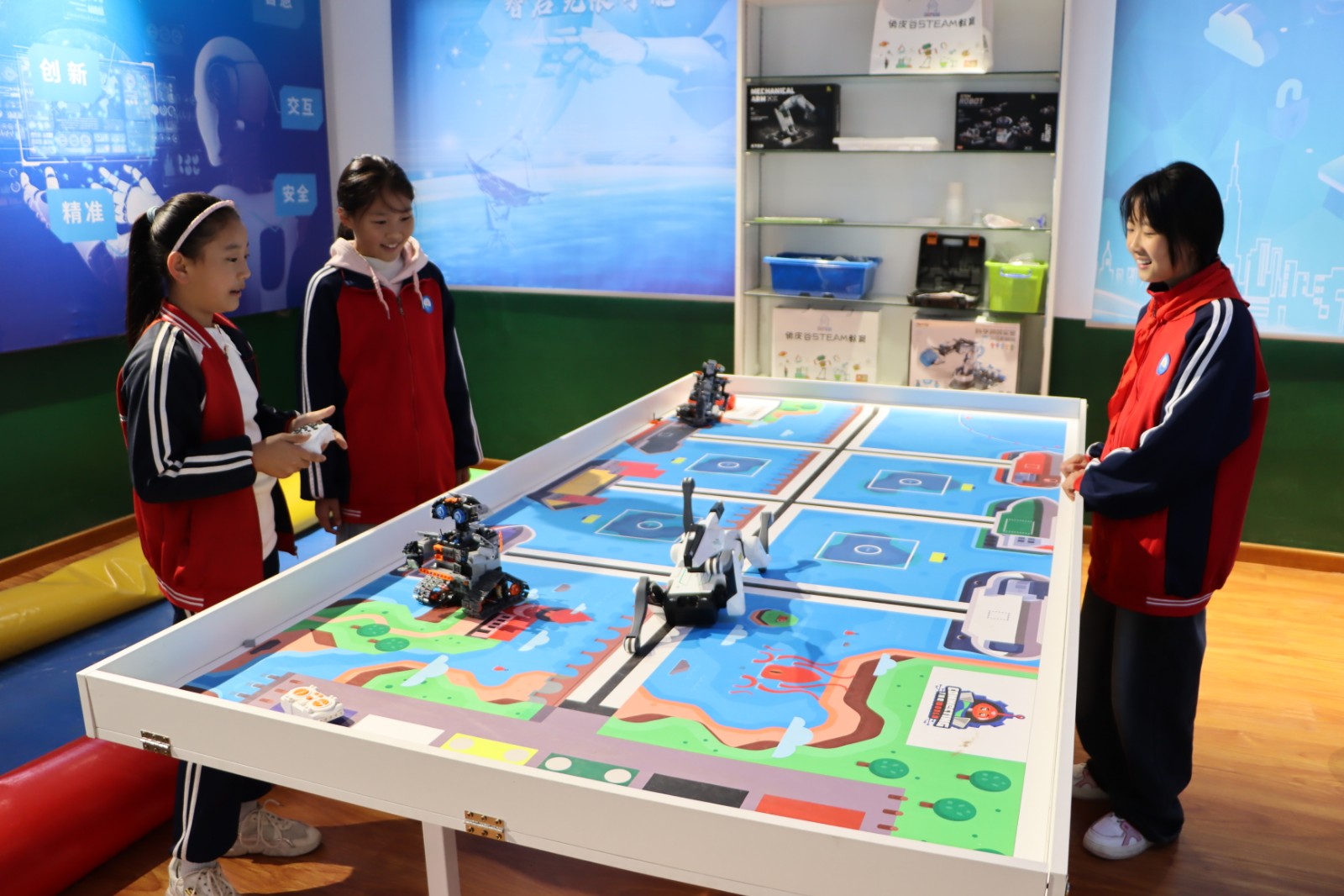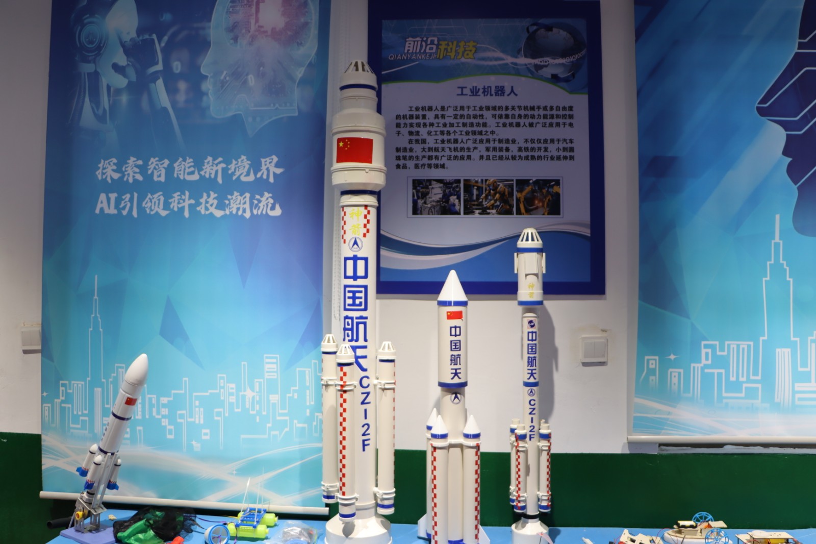 科普课堂进乡村,知识宣讲暖民心。整合186名党员机关干部、42名党员教师组成骨干力量,既深度参与科普服务,又延伸融入社区治理,通过技能培训与实践锻炼,队伍专业能力持续提升,构建起“科普聚人心、治理齐参与”的良好格局。同时在小市庄社区打造科普体验馆,让村民在家门口就能触摸前沿科技:展厅里,长征CZ-2F等系列火箭模型整齐陈列,旁边的“前沿科技”展板详细介绍工业机器人的应用场景;蓝色背景墙上“探索智能新境界AI引领科技潮流”的标语格外醒目,为乡村添上了“科技感”的注脚。